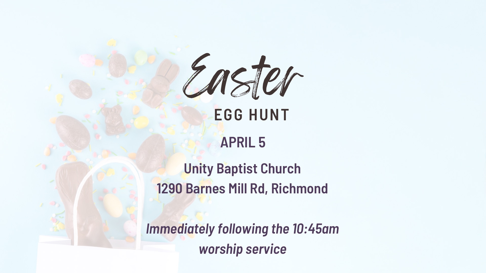 Join us for an Easter Egg Hunt immediately after morning worship! Children of all ages are invited—bring your baskets and enjoy the fun!