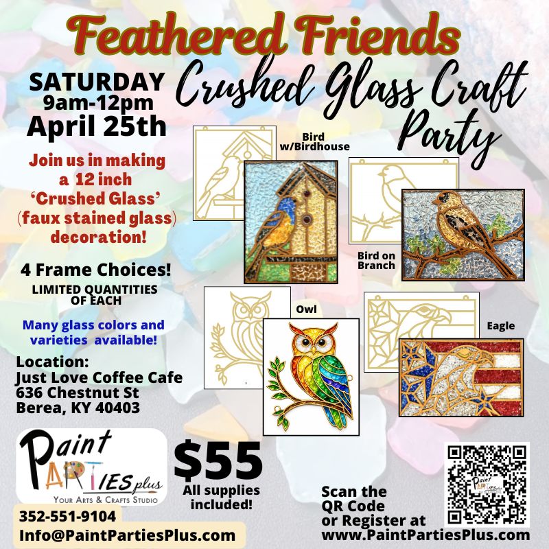 Join us in creating one of 4 beautiful 12" 'Feathered Friends' designs in Crushed Glass. Choose your favorite! We offer a large variety of types and colors of glass to […]
